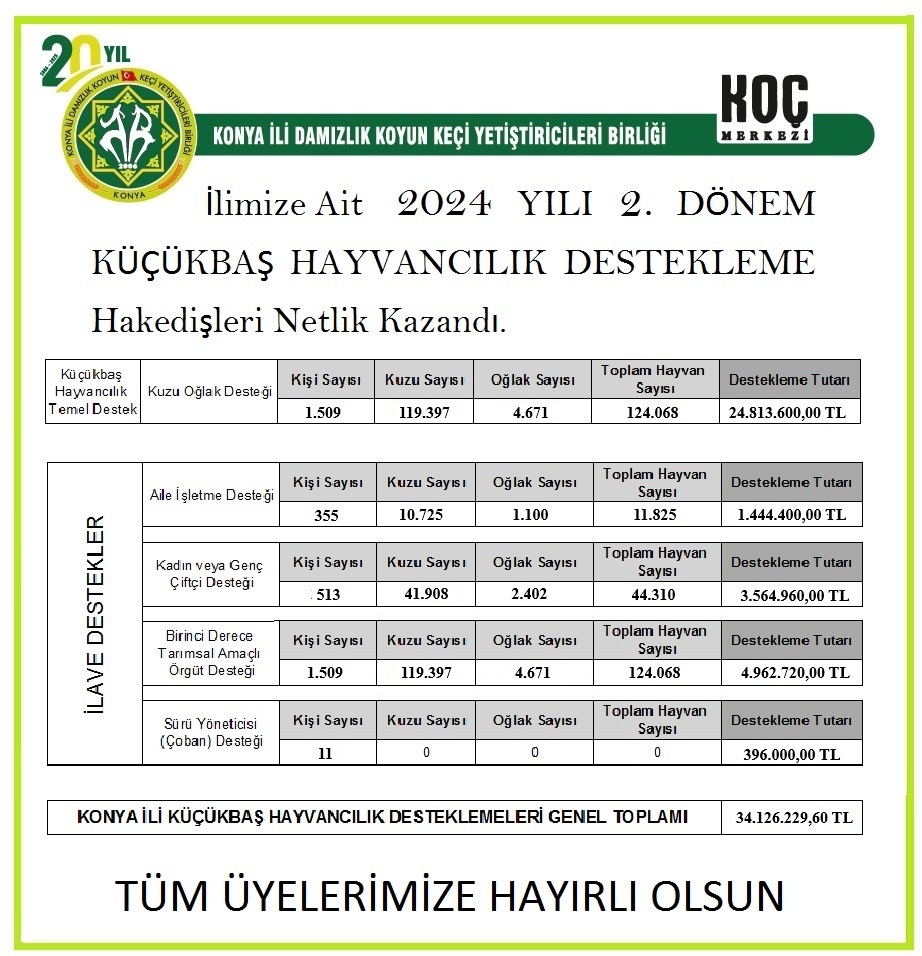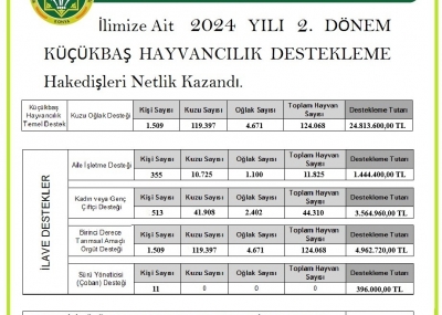 2024 Yılı 2.Dönem Küçükbaş Hayvancılık Destekleme Dönemi Hakedişlerin Netlik Kazanmasıyla Son Bulmuştur. Hakedişler Her Yıl Olduğu Gibi Bakanlık Tarafından Üyelerimizin Hesaplarına Yatırılacaktır. Hakedişlerin En Kısa Sürede Yatırılması İçin Başkanımız Sayın Fettah Öztürk’ün Çalışmaları Devam Etmekte Olup, Olumlu Sonuçlanacağını Umut Ediyoruz.